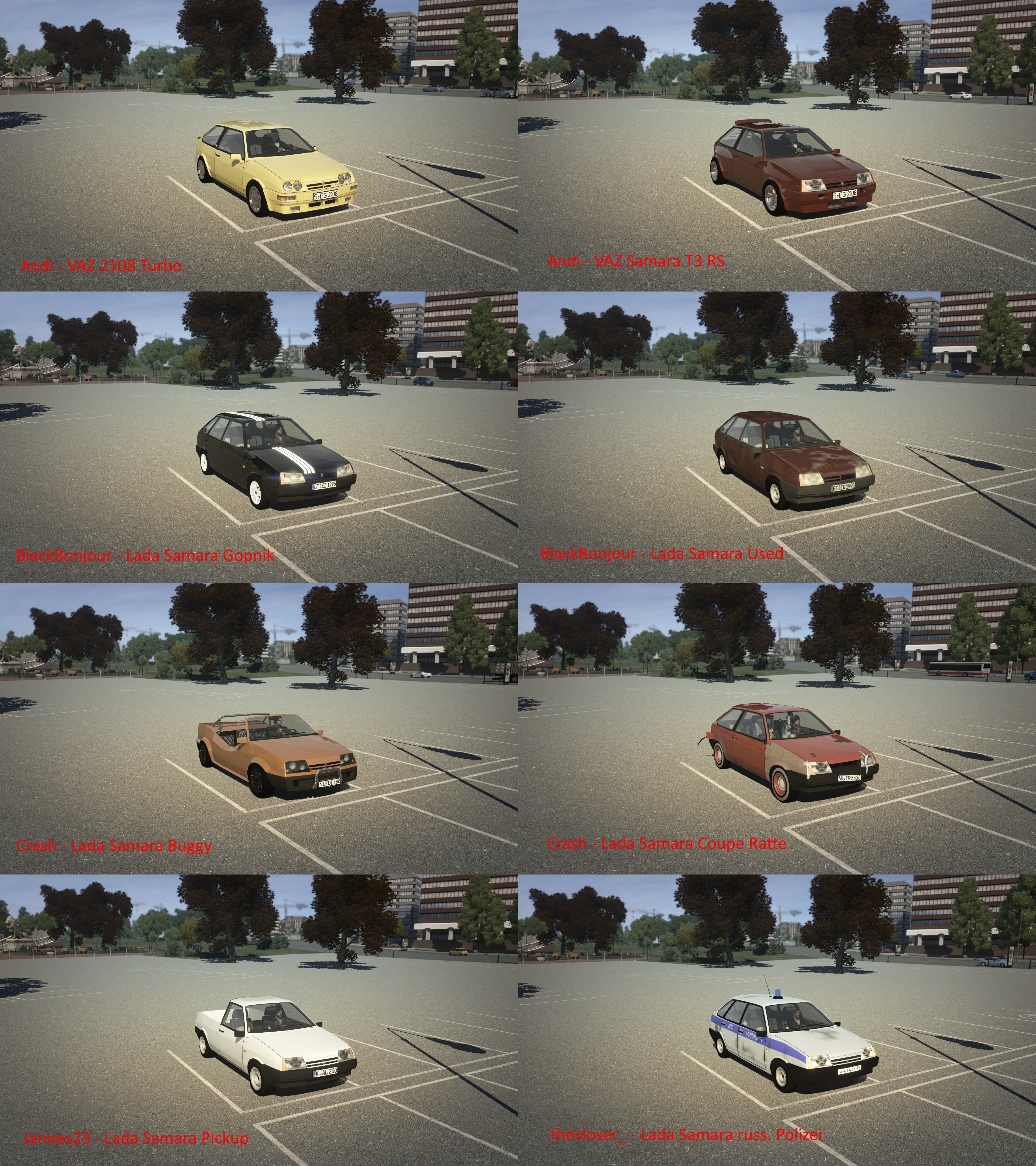 Einige der Teilnehmer wurden für World Racing 2 (WR2) eingesendet und wurden von mir nach C11 - Das Syndikat (DS) konvertiert. Daher kann es ggf. bei einigen Wagen zu vom Modder ungewollten Abweichungen der Fahreigenschaften, MTL-Einstellungen und Lichtern kommen. Diese Wagen sind unten mit entsprechendem Vermerk versehen worden.