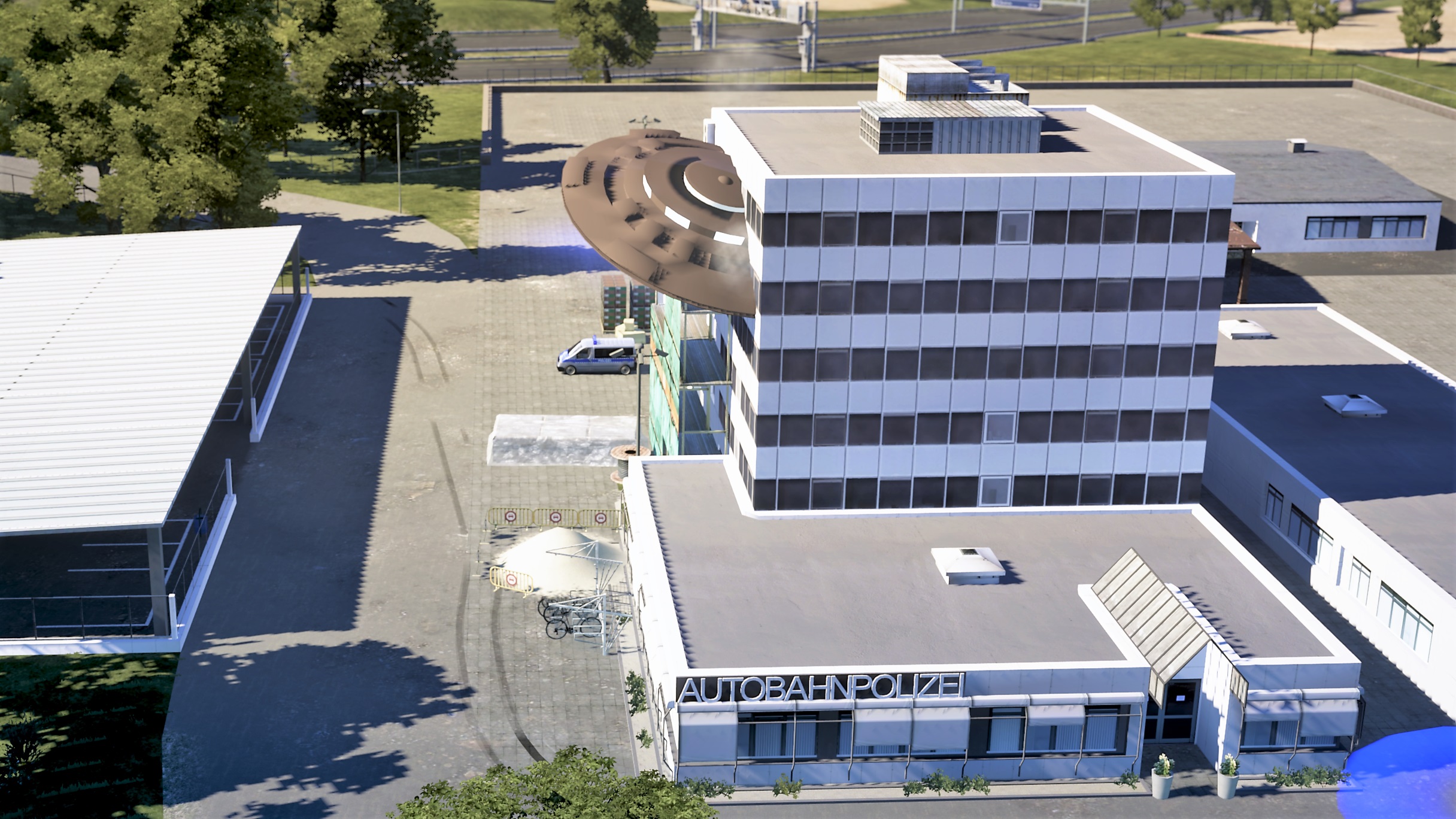 Dazu gibt es einen Sandhaufen vor dem Revier, der abgesperrt ist, ein paar Kisten, die mit einer Plane bedeckt sind, eine Kabelrolle und ein Gerüst.